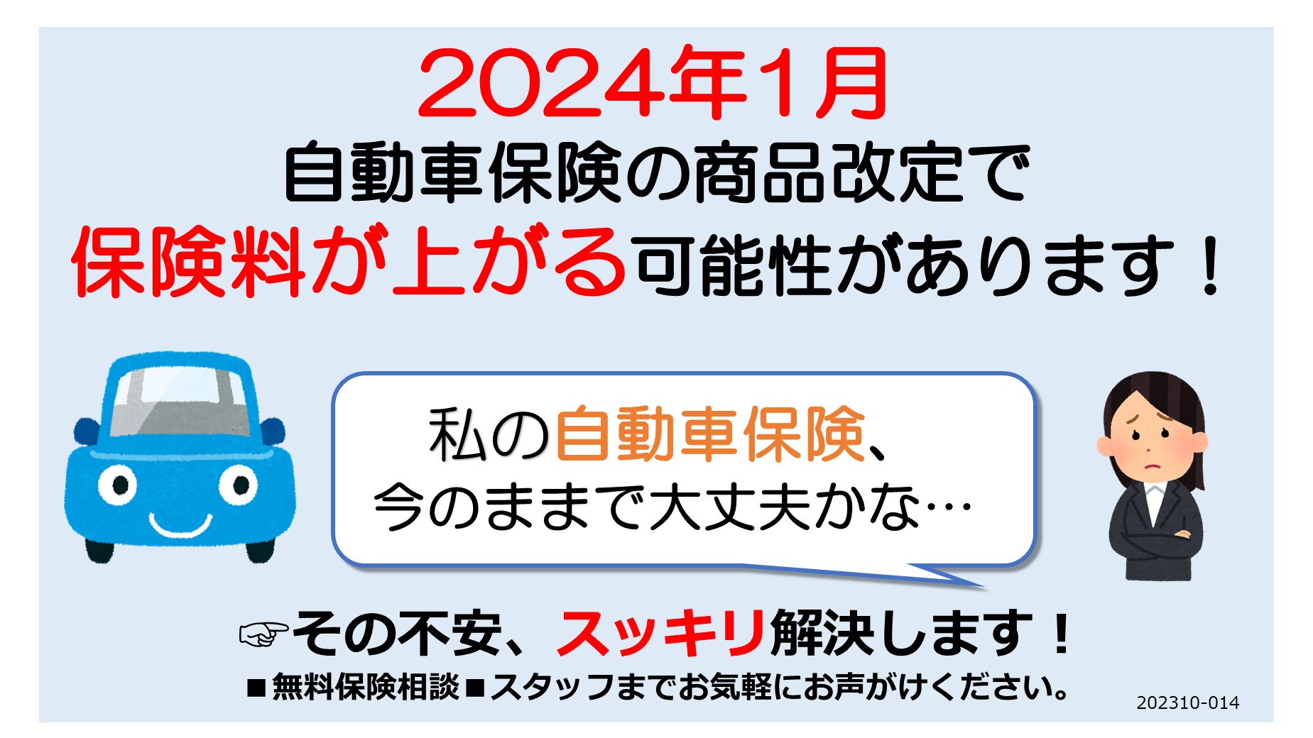 2024年1月自動車保険が値上げ!? 2023年12月4日(月)~2024年1月1日(月) ほけんの相談ショップ イオンモール座間店 こんにちは!!ほけんの相談ショップイオンモール座間店です。2024年1月に自動車保険の料率改定により保険料の値上げが行われる会社がいくつかあります。1月以降に更新を迎える方は、等級によっても変わりますが12月までに見直した方が安くなる場合もございます!今の自動車保険のままで大丈夫かな?そもそもどんな補償内容かわからない…そのようなお考えの皆さま。この機会に自動車保険の内容確認してみませんか?ご来店の際はお車の情報のわかるものをお持ちください。 店舗ページはこちらから
