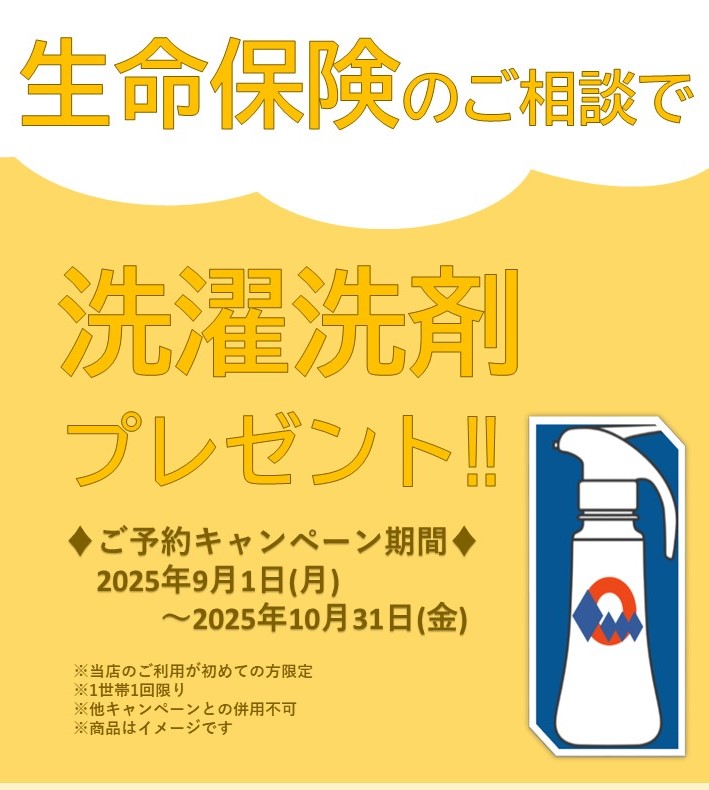 ご相談キャンペーン実施中! 2025年9月1日(月)~2025年10月31日(金) ほけんの相談ショップ イオンスタイル板橋前野町店 ★実施中のキャンペーンのご案内です★10月31日(金)までに生命保険のご相談でご予約をいただいたお客様へ洗濯洗剤をプレゼントさせていただきます! ※当店のご利用がはじめての方に限ります・保険に加入したいけれども、どんな保険がよいのかわからない・今加入している保険、このままでよいのか悩んでいるこのような方はいらっしゃいませんか?当店では保険の仕組みのご説明や、加入内容の確認も無料で行っております。まずは話を聞いてみたいという方も大歓迎です!皆様のご来店、スタッフ一同お待ちしております!! 店舗ページはこちらから