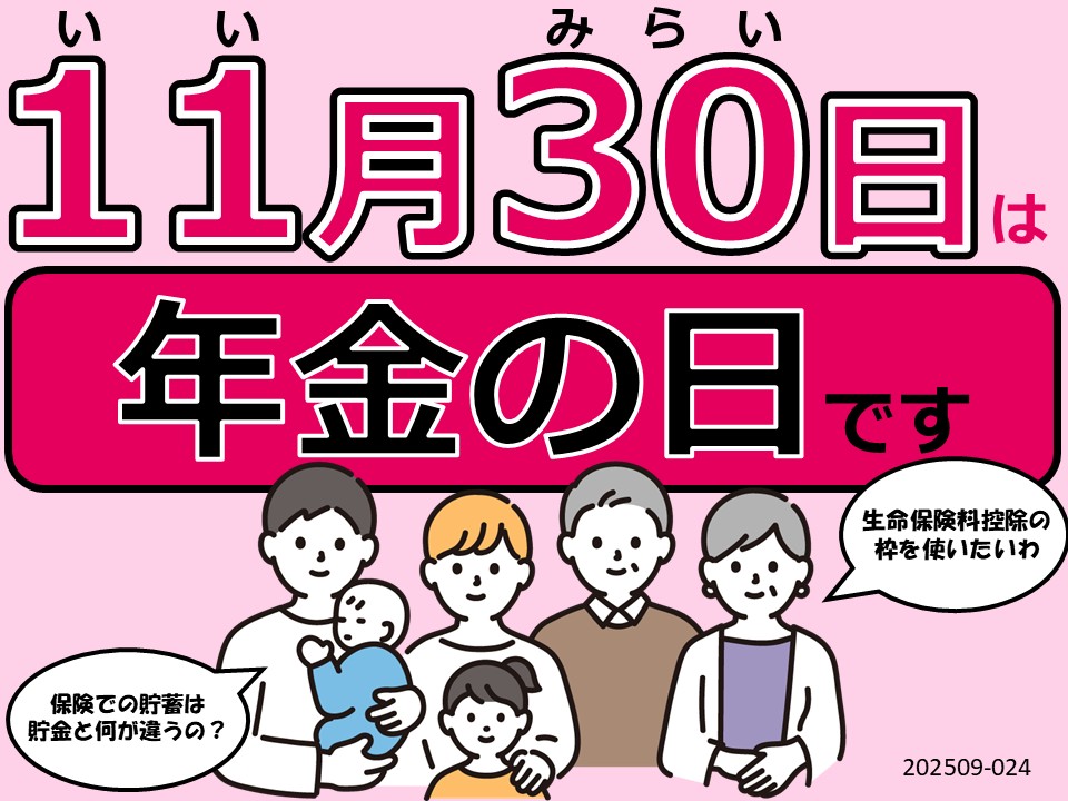 厚生労働省が、国民ひとりひとりがねんきんネット等を活用しながら、老後の生活設計を考えてもらう機会をつくるために、毎年11月30日を「いい未来の日」の語呂合わせで年金の日と定めました。