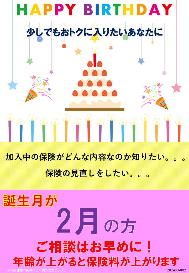 ほけんの相談ショップ・ライフサロン イベント・キャンペーン イベント・キャンペーン 【2月】がお誕生日の皆様へ 2026年1月1日(木)~2026年1月31日(土) ほけんの相談ショップ ダイエー宝塚中山店 ご覧いただきありがとうございます!ほけんの相談ショップダイエー宝塚中山店です。お誕生日を迎え、ご年齢が上がると『 保険料 』も上がります! そのため、2月がお誕生日の方は【1月中】のご相談・ご来店がおすすめです♪保険の加入や見直しをお考えの方はぜひご来店ください! 店舗ページはこちらから 保険の無料相談のご予約はこちら