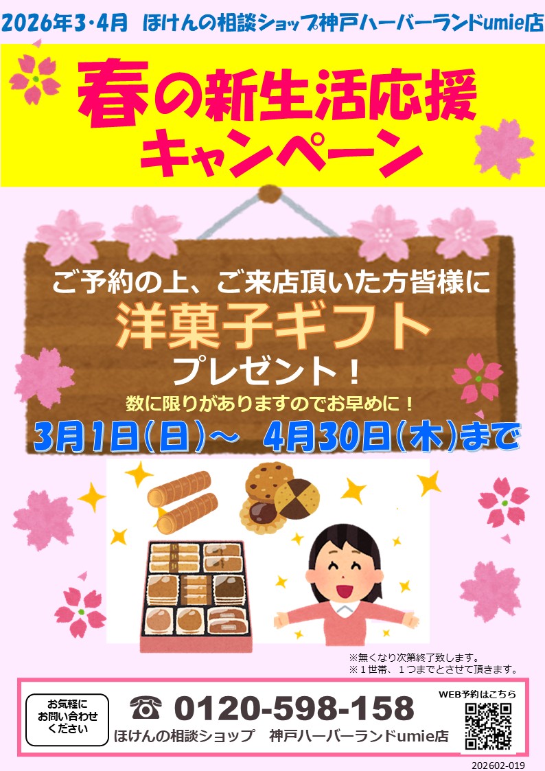 ほけんの相談ショップ・ライフサロン イベント・キャンペーン イベント・キャンペーン ☆4月キャンペーンのご案内☆ 2026年4月1日(水)~2026年4月30日(木) ほけんの相談ショップ 神戸ハーバーランドumie店 4月も引き続き、ご予約の上、保険ご相談いただくと『洋菓子』プレゼント❕ 『加入中の保険が自分に合っているのか確認したい』『CMで見た保険が気になる』 『将来の資産形成の相談がしたい』など、保険で気になることがございましたら、 ぜひこの機会にご相談ください❕ ご予約は当ホームページ、もしくはお電話でも受付中です! 皆さまのご来店をお待ちしております😊 店舗ページはこちらから 無料相談のご予約はこちら 店舗を探す オンラインで相談する