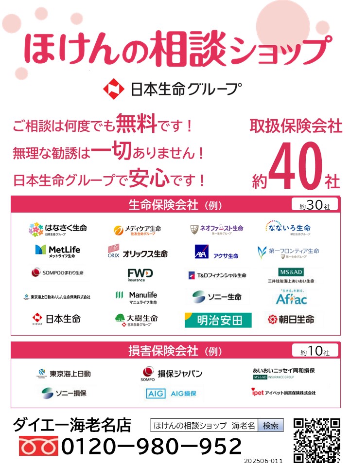 当店は、日本生命グループの総合代理店です。約40社の保険会社の中から、お客様のご意向に沿った保険案内ができます。ご相談は何度でも無料です!