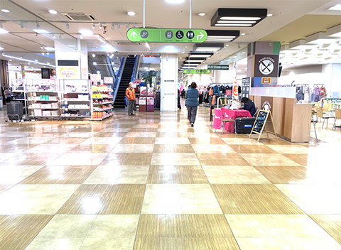エスカレーターを挟んで右側の通路を直進します。右手側にクリーニング屋さんや携帯ショップがあります。