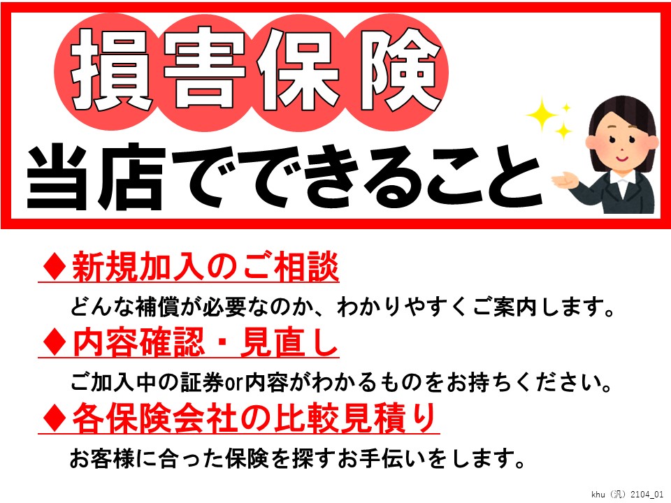 火災・自動車・傷害・旅行など、各種損害保険を取り扱っております。新規加入や見直し、内容確認、保険料比較などもすべて無料で行っております。保険料は保険会社により様々ですので、相見積もりを取ることをおすすめいたします。※自賠責保険のお取り扱いはございません。予めご了承ください。※旅行保険は出発日の1週間前までにご相談ください。※東京海上日動、損保ジャパンなどの大手の取り扱い有