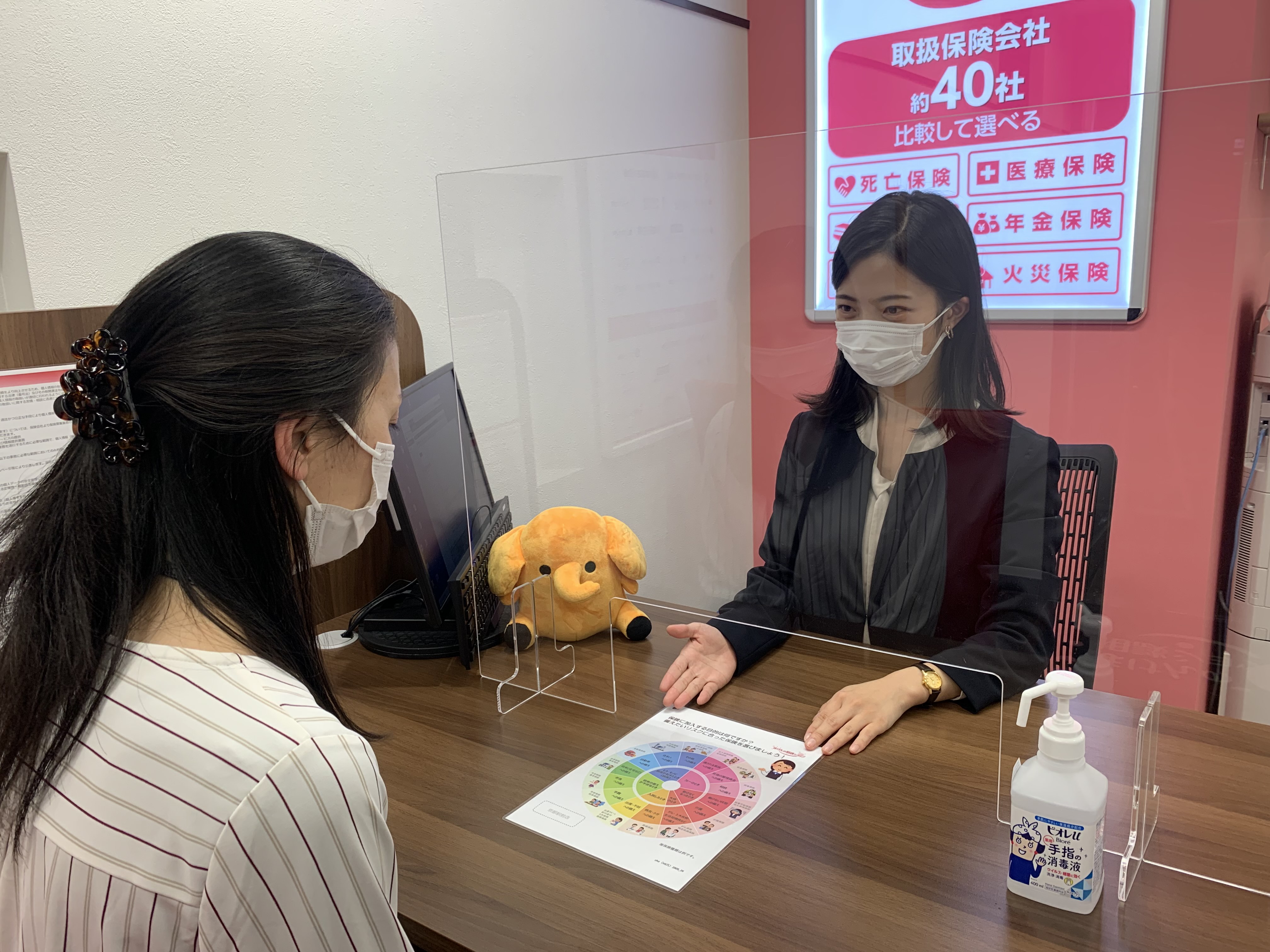 ブースに備え付けのホワイトボードを使い、お客様のご希望、保険の基礎知識、加入内容などを図にしてお話しいたします。ずっとわからなかった保険の内容がやっと理解できた!家族にも説明しやすかった!など、ご好評を多数いただいております!