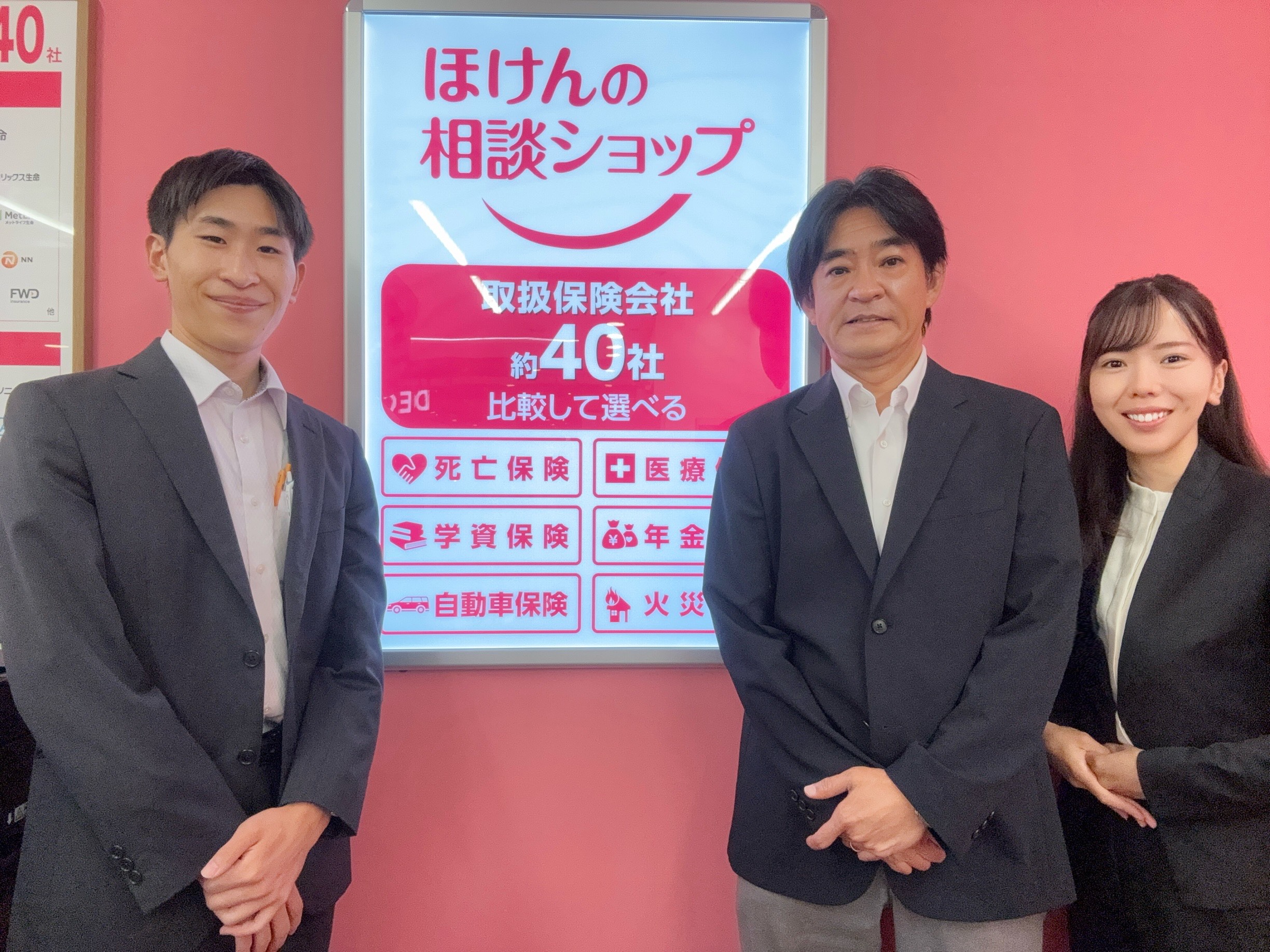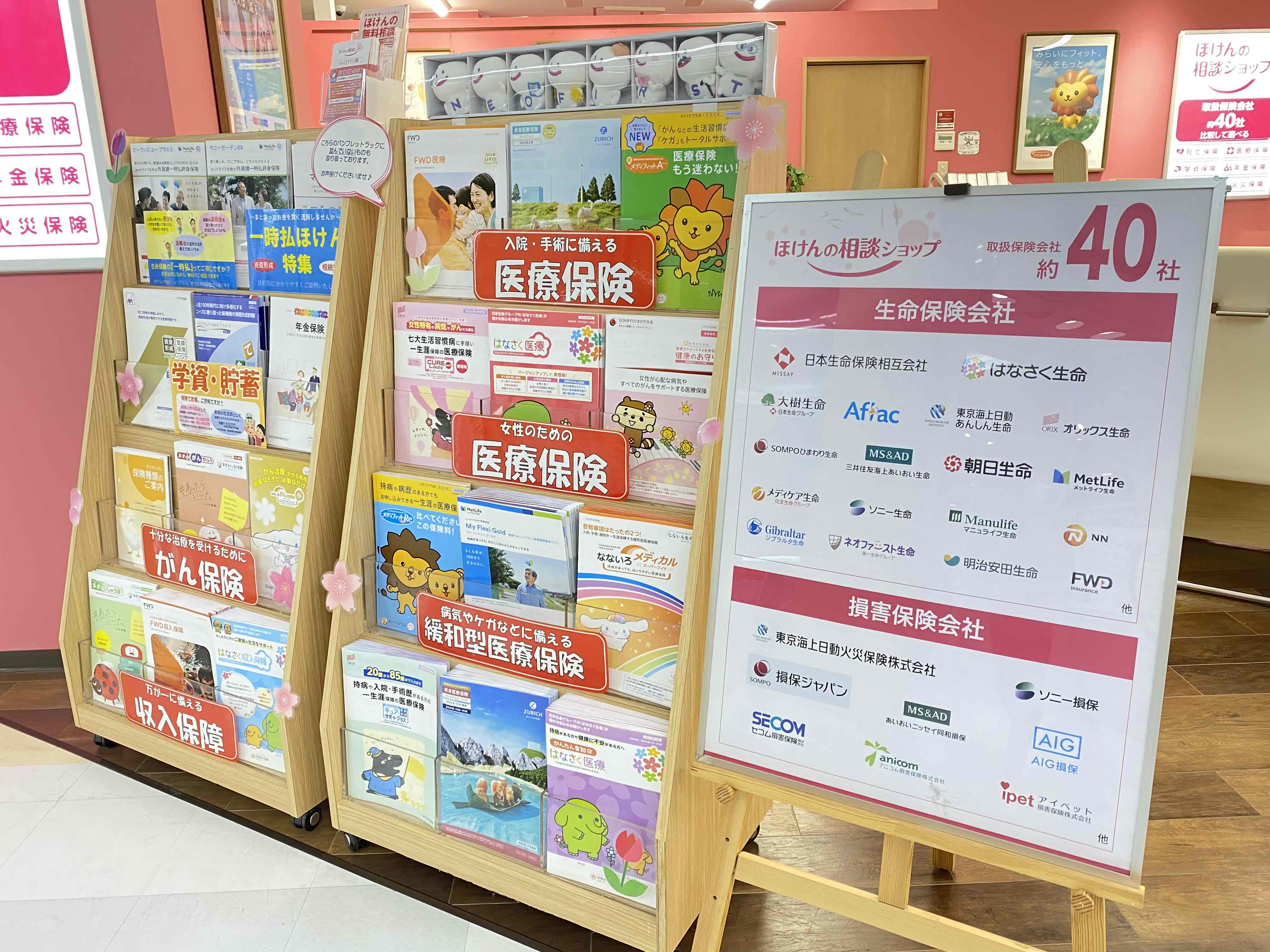 当店では約40社の保険会社の保険商品を取り扱っております。店頭にもたくさんのパンフレットがありますので、ぜひ一度、お立ち寄りください。