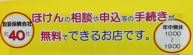 | 取扱商品 | (生命保険) 医療保険、がん保険、個人年金保険、学資保険、介護保険、収入保障保険、外貨建保険、就業不能保険、変額保険、終身保険、定期保険、養老保険 (損害保険) 自動車保険、自転車保険、火災保険、傷害保険、企業賠償責任保険、業務災害補償保険、ペット保険 |