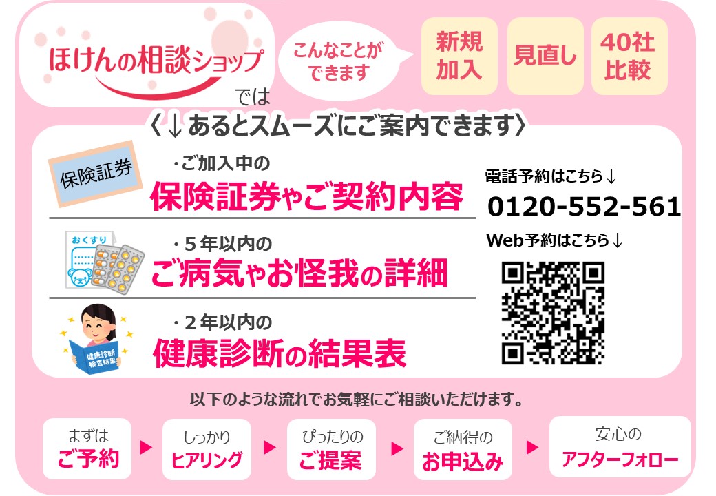 ご加入中の保険の見直しや比較、初めての保険相談も大歓迎です!お気軽にお立ち寄りください。